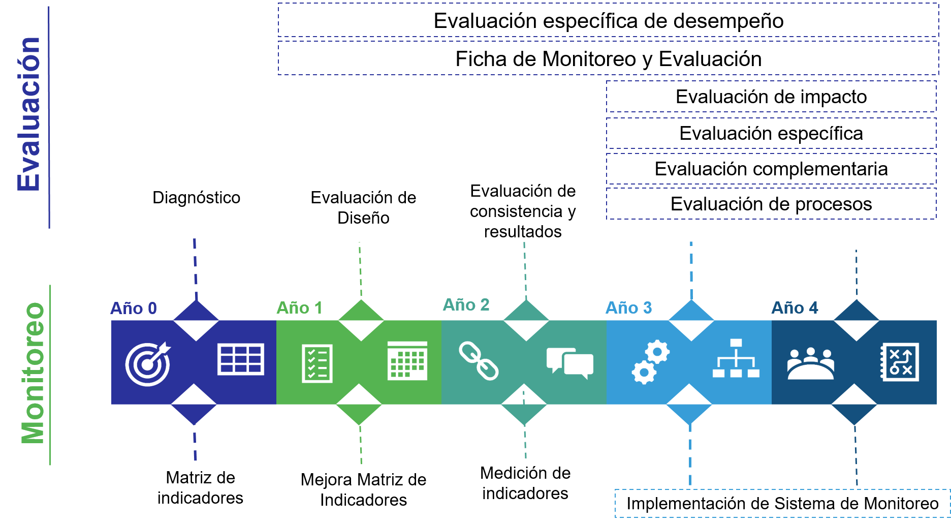 El CONEVAL desarrolló el Horizonte de Monitoreo y Evaluación, una representación analítica ideal del ciclo de acciones de monitoreo y evaluación a las que debería estar sujeto un programa de desarrollo social: