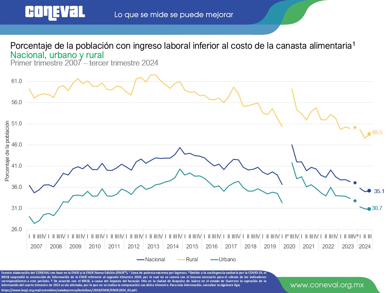 Entre el tercer trimestre de 2023 y el tercer trimestre de 2024, el porcentaje de la población con ingreso laboral inferior al valor monetario de la canasta alimentaria (pobreza laboral) a nivel nacional mostró una disminución anual, de alrededor de 2.2 puntos porcentuales, al pasar de 37.3% a 35.1%.