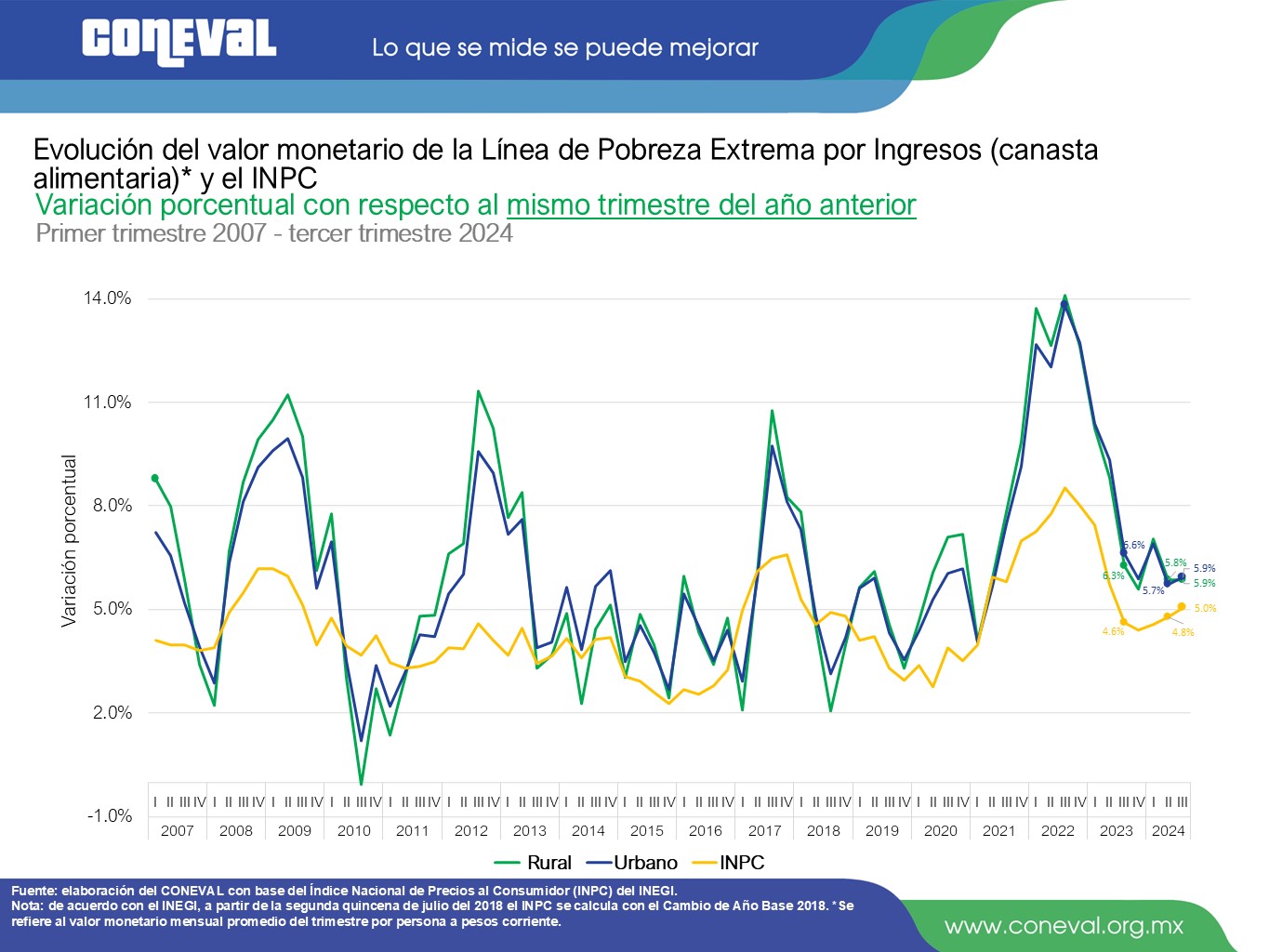 - La disminución de la pobreza laboral entre el tercer trimestre de 2023 y el tercer trimestre de 2024 se dio en un contexto donde el valor monetario de la canasta alimentaria mostró un aumento de 5.9% tanto en el ámbito rural como en el urbano, mientras que la inflación general anual promedio se ubicó en 5.0%.