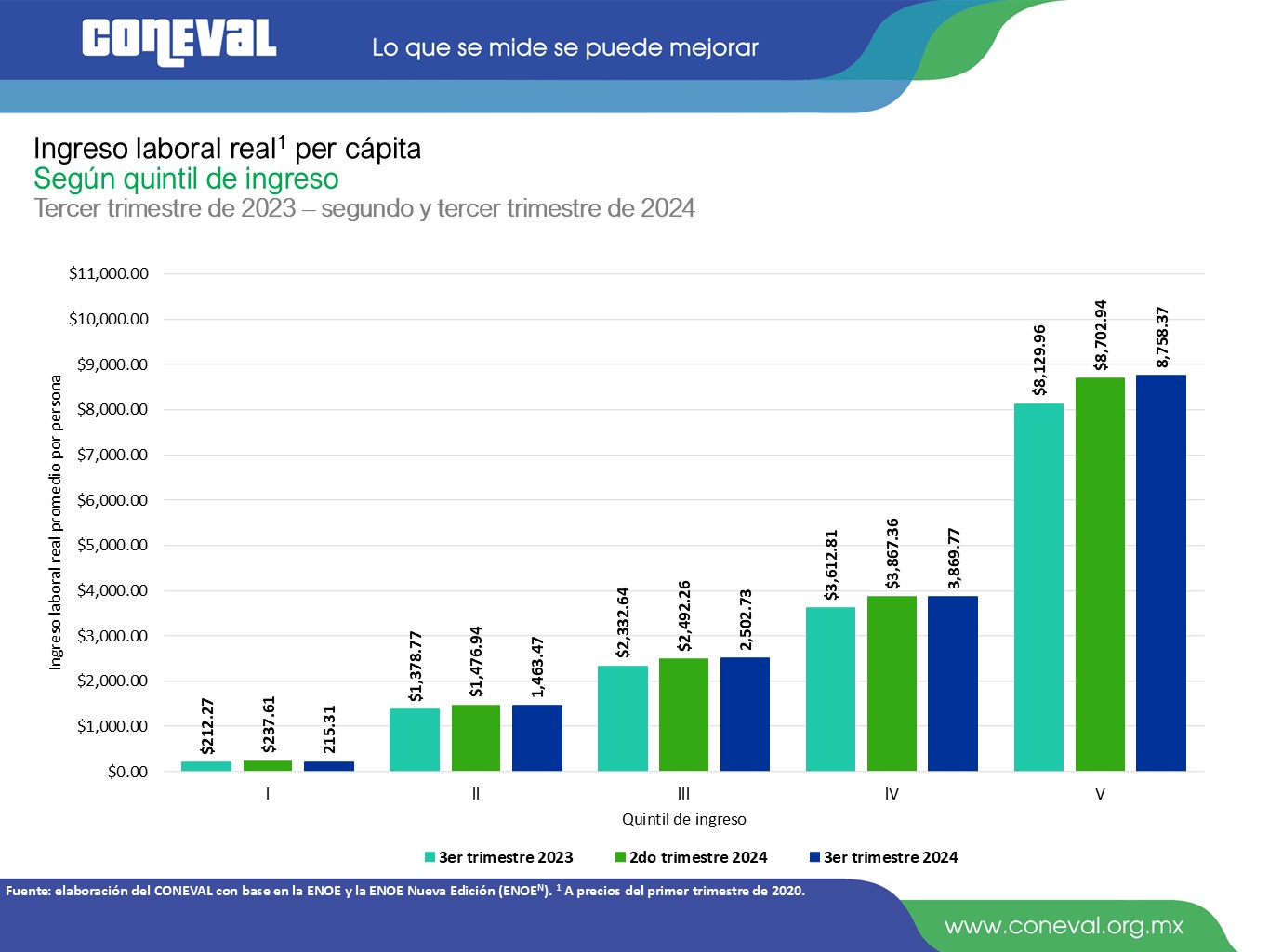 En cuanto a la razón del ingreso laboral real per cápita, durante el tercer trimestre de 2024 se observó que el ingreso del último quintil representó 40.7 veces el ingreso del primer quintil. En el tercer trimestre de 2023, esta razón fue de 38.3 veces, mientras que para el segundo trimestre de 2024 fue de 36.6 veces.