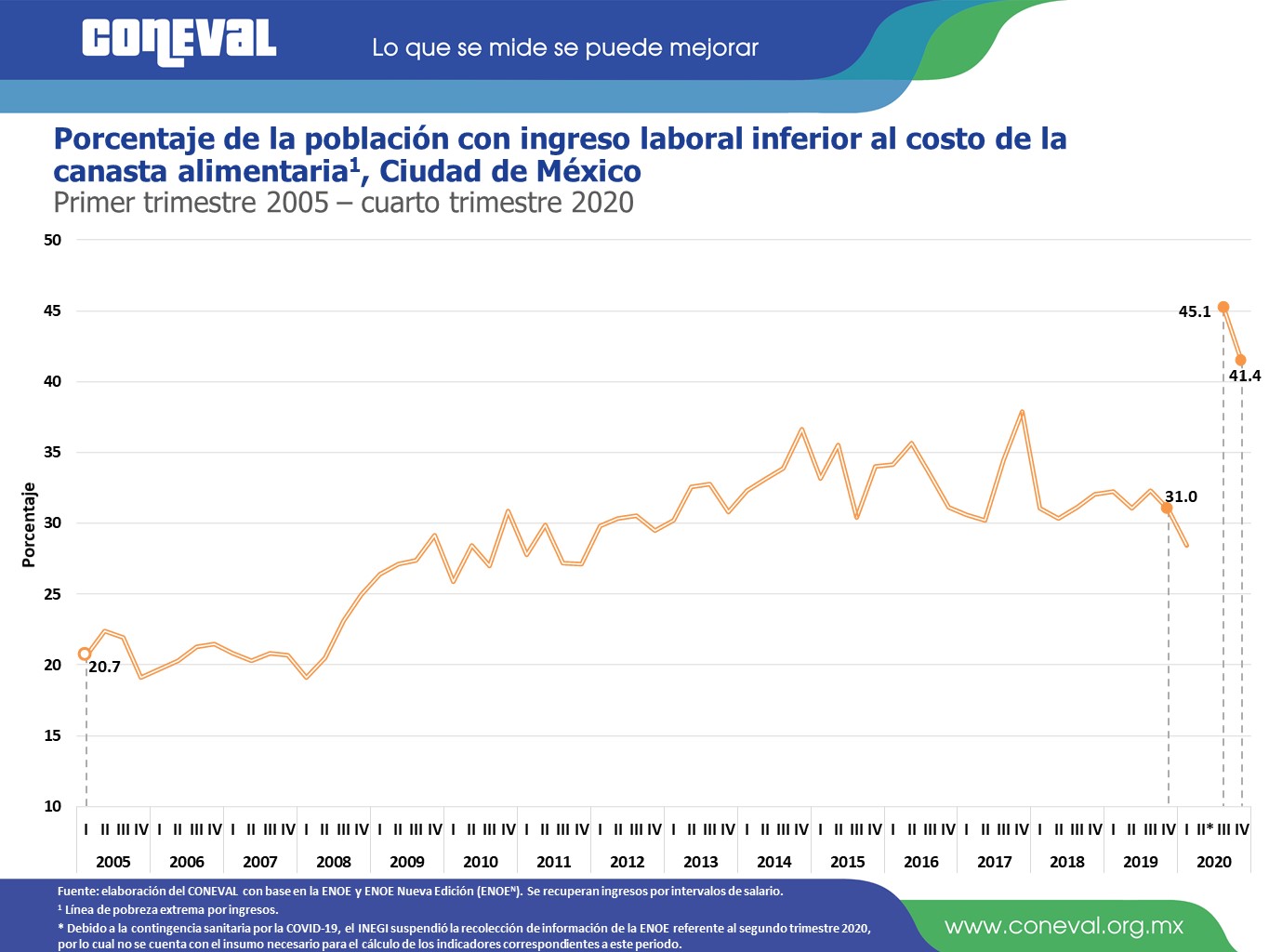 Debido a la contingencia sanitaria por la COVID-19, el INEGI suspendió la recolección de información de la ENOE referente al segundo trimestre 2020. En su lugar y a partir del 3 de septiembre se utiliza la ENOE Nueva Edición (ENOEᴺ). El CONEVAL publica los resultados correspondientes al cuarto trimestre del 2020 estimados a partir de los datos de la ENOEᴺ.