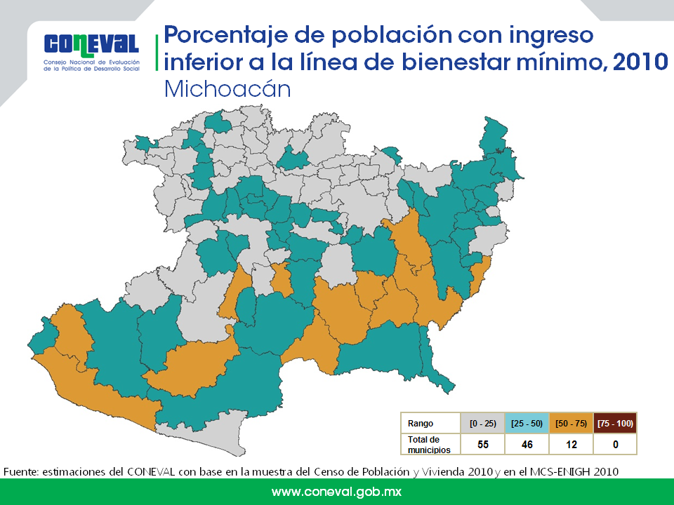 El estado cuenta con 113 municipios distribuidos en los siguientes rangos de porcentaje de población en pobreza: