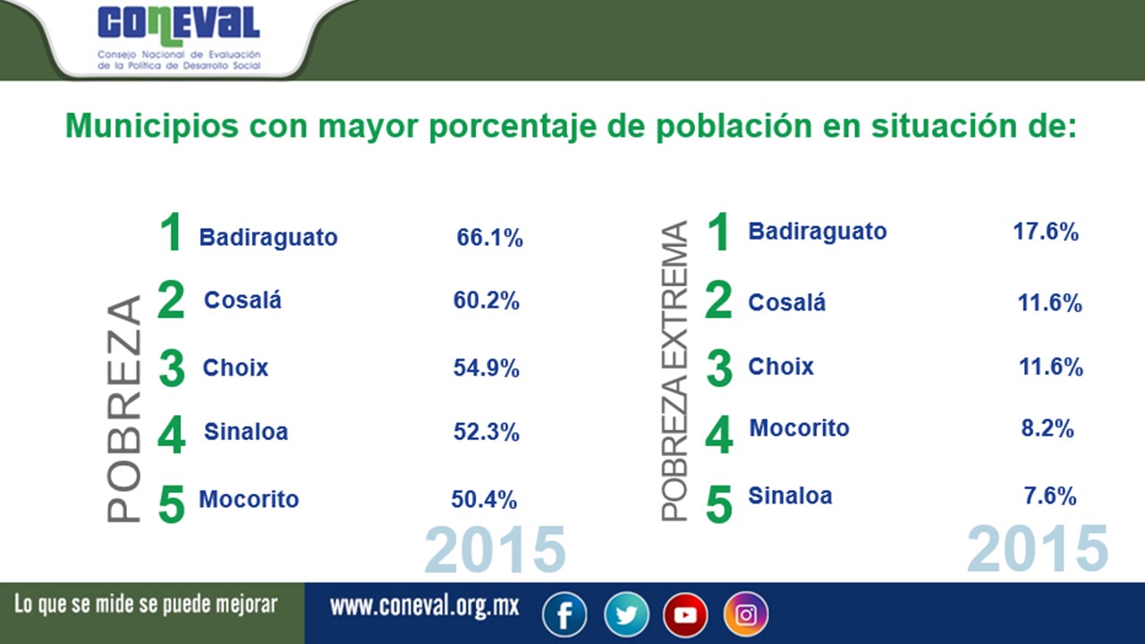 El Consejo Nacional de Evaluación de la Política de Desarrollo Social (CONEVAL) da a conocer a la ciudadanía la medición de pobreza a nivel municipal en 2015 y su comparativo con el año 2010. Con esta información se tienen, por primera vez, dos estimaciones en el tiempo de los indicadores de la medición multidimensional de la pobreza para los municipios del país, cuya comparabilidad registra la evolución de la pobreza a escala municipal.